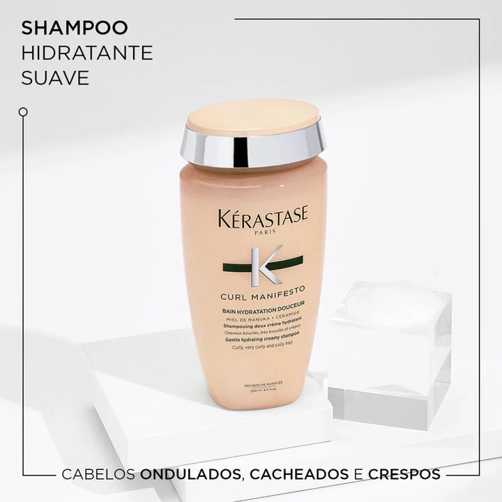 O Bain Hydratation Douceur é um shampoo para cabelos cacheados, crespos e ondulados que hidrata profundamente os fios. Enriquecido com Mel de Manuka e Ceramida, limpa o couro cabeludo, removendo impurezas, e reforça a barreira de proteção natural da fibra, proporcionando cabelos hidratados sem pesar. Por isso, o Shampoo Kérastase Curl Manifesto é o melhor shampoo para cabelos cacheados e ressecados.